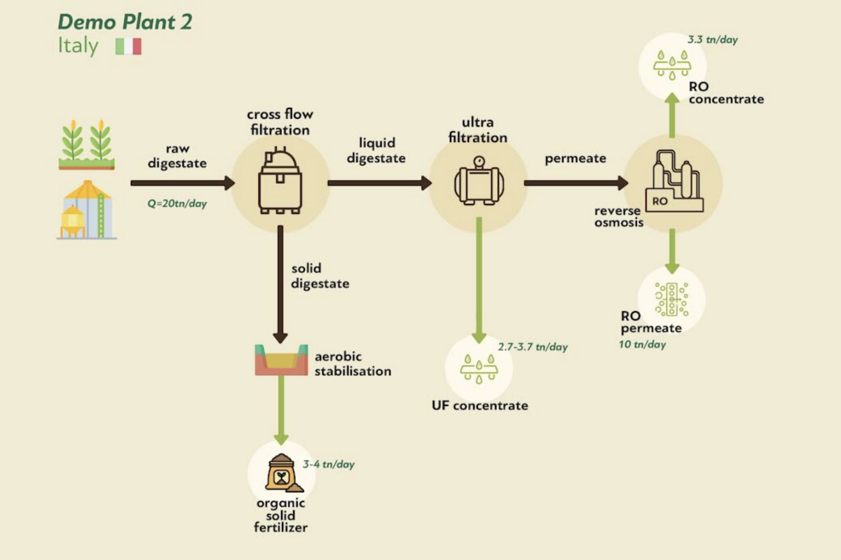 In Italia, presso l’azienda agricola “La Torre” a Isola della Scala, e in Grecia sono operativi due impianti che mettono alla prova tecnologie innovative per estrarre nutrienti dal digestato. In particolare, l’impianto italiano DEMO 2, progettato dall’università di Verona e realizzato dalla società Nuove Energie, tratta circa 20 tonnellate di digestato al giorno.