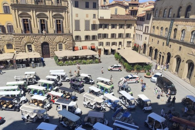 A Firenze, davanti a Palazzo Vecchio, un gruppo di conducenti di risciò, golf car e caddy ha manifestato contro il regolamento comunale che...